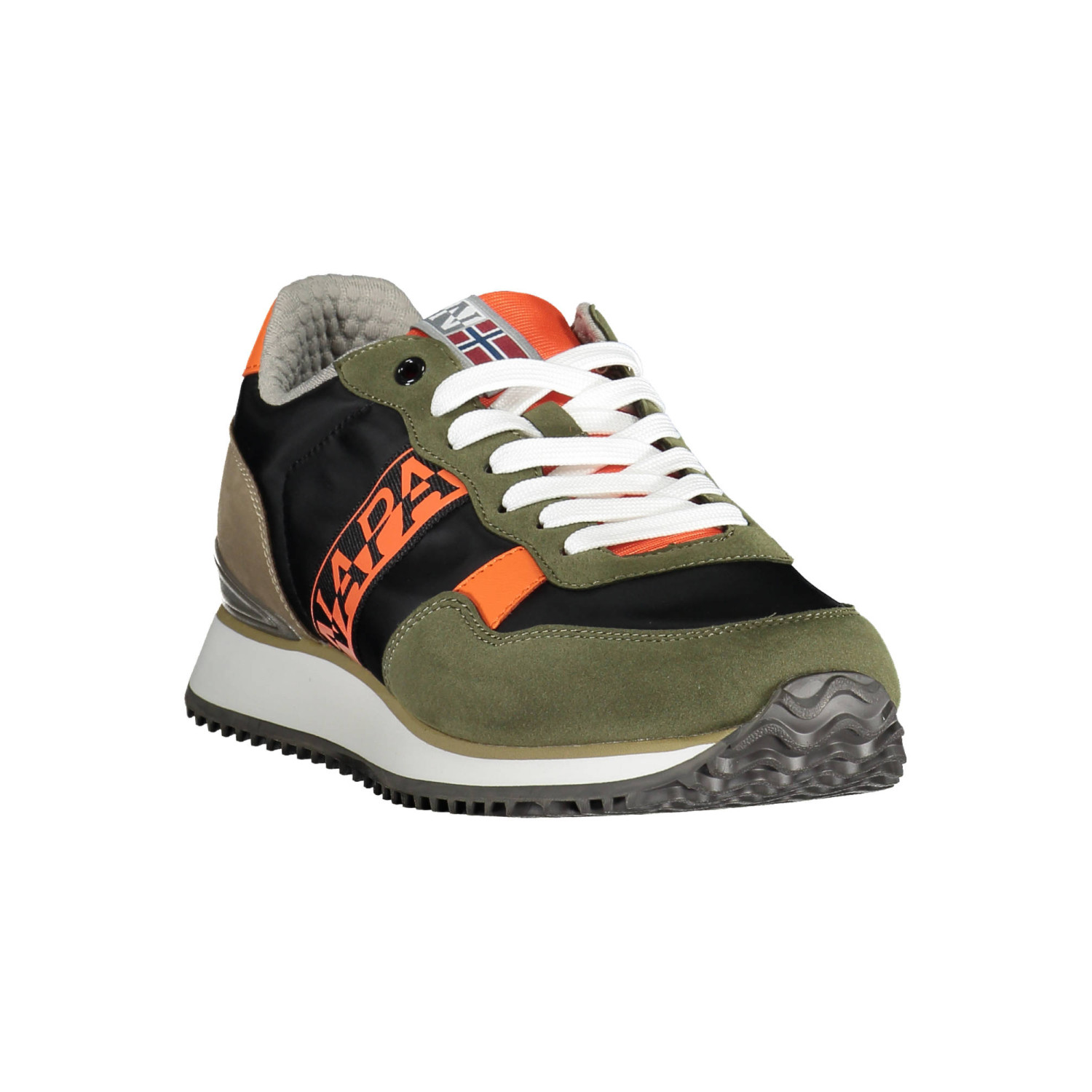 calzatura sportiva con lacci, dettagli a contrasto, logo