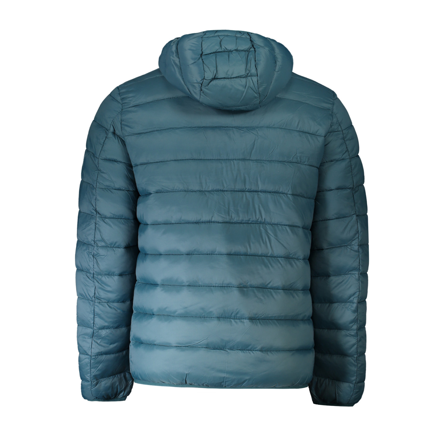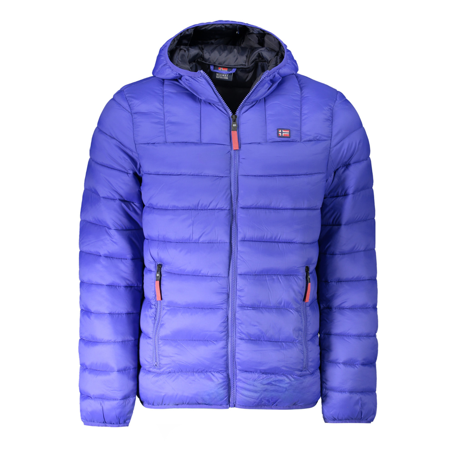GIUBBOTTO MANICHE LUNGHE CON CAPPUCCIO, 2 TASCHE ESTERNE, DETTAGLI A CONTRASTO IN BLU, ZIP, APPLICAZIONE, LOGO
