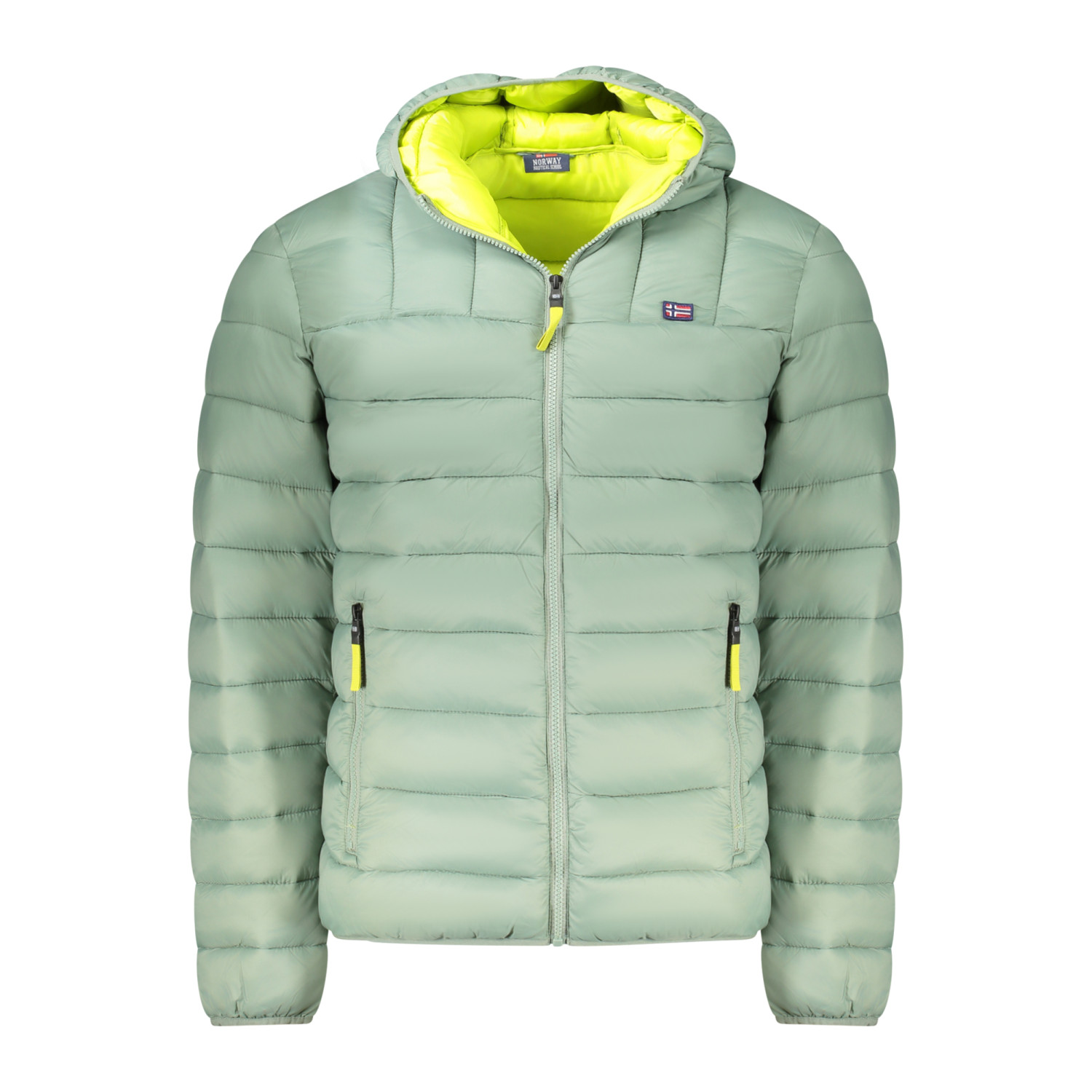 GIUBBOTTO MANICHE LUNGHE CON CAPPUCCIO, 2 TASCHE ESTERNE, DETTAGLI A CONTRASTO IN GIALLO, ZIP, APPLICAZIONE, LOGO