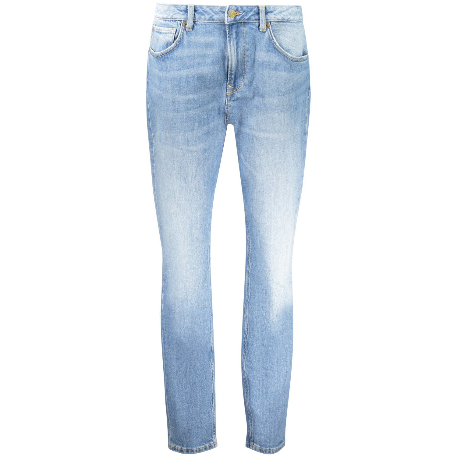 JEANS 5 TASCHE, TAPER, EFFETTO SLAVATO, BOTTONE, ZIP, LOGO